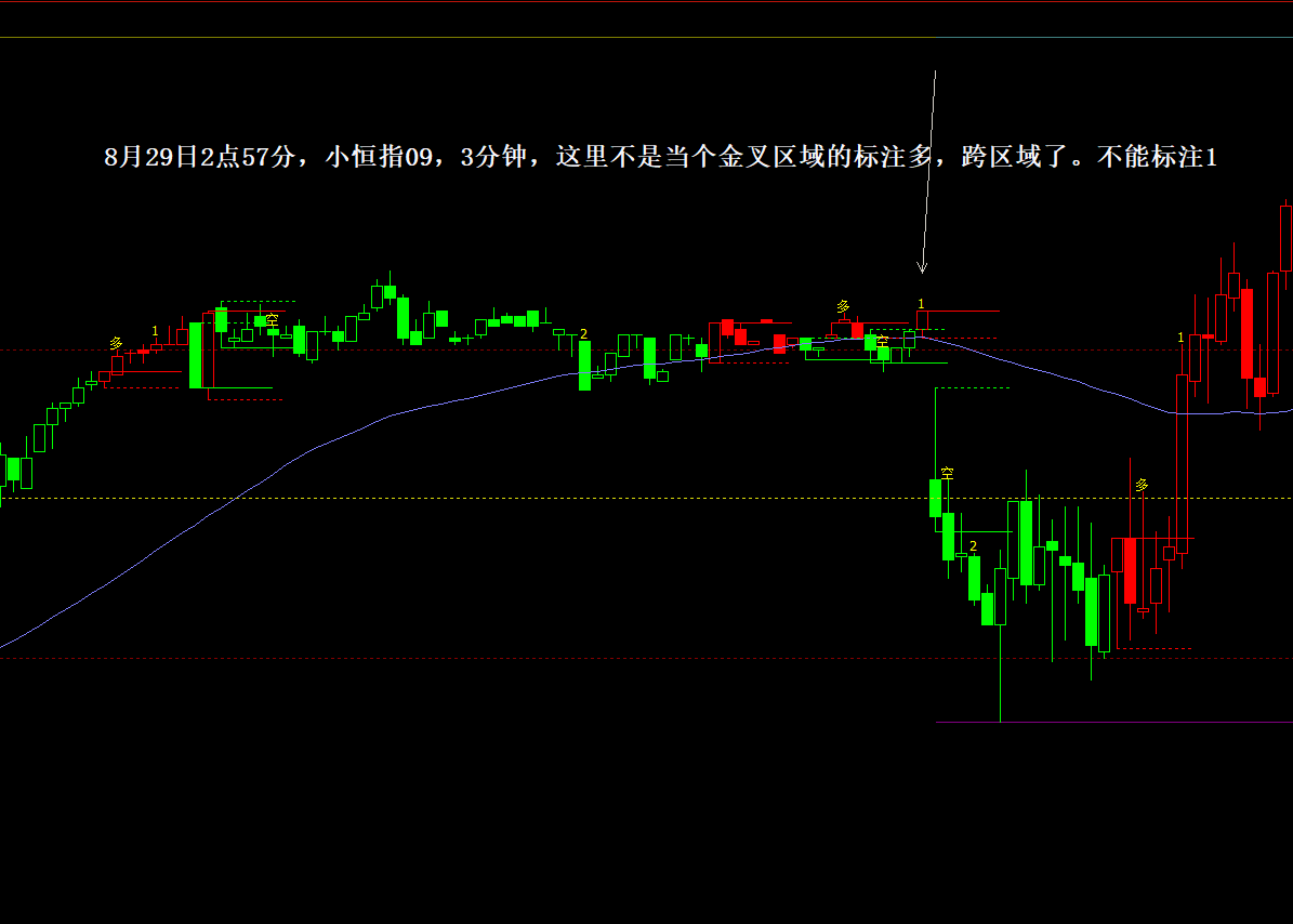?標注多的K線最高點被當個金叉區(qū)域中收盤價大于時在這個大于的K線標注1(必須是當前這個金叉區(qū)域中大于的K線,不能跨區(qū)域)同理標注空的K線最低點被收盤價小于標注2,每個金叉死叉區(qū)域只標注一次1或2